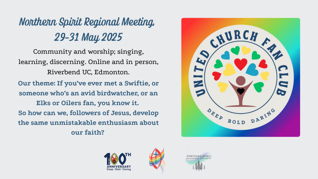 Northern Spirit Regional Council meets at least once a year, online or as a hybrid online and in-person gathering. It conducts the business of the Regional Council, such as setting policy and priorities, or voting on relevant national matters. Worship, singing, education, discussion, honouring retirees, remembering members who have died, and above all, being together as the Body of Christ are all vital parts of the meeting. The meeting usually concludes with public worship at which new ministry personnel are admitted, recognized, commissioned, or ordained.